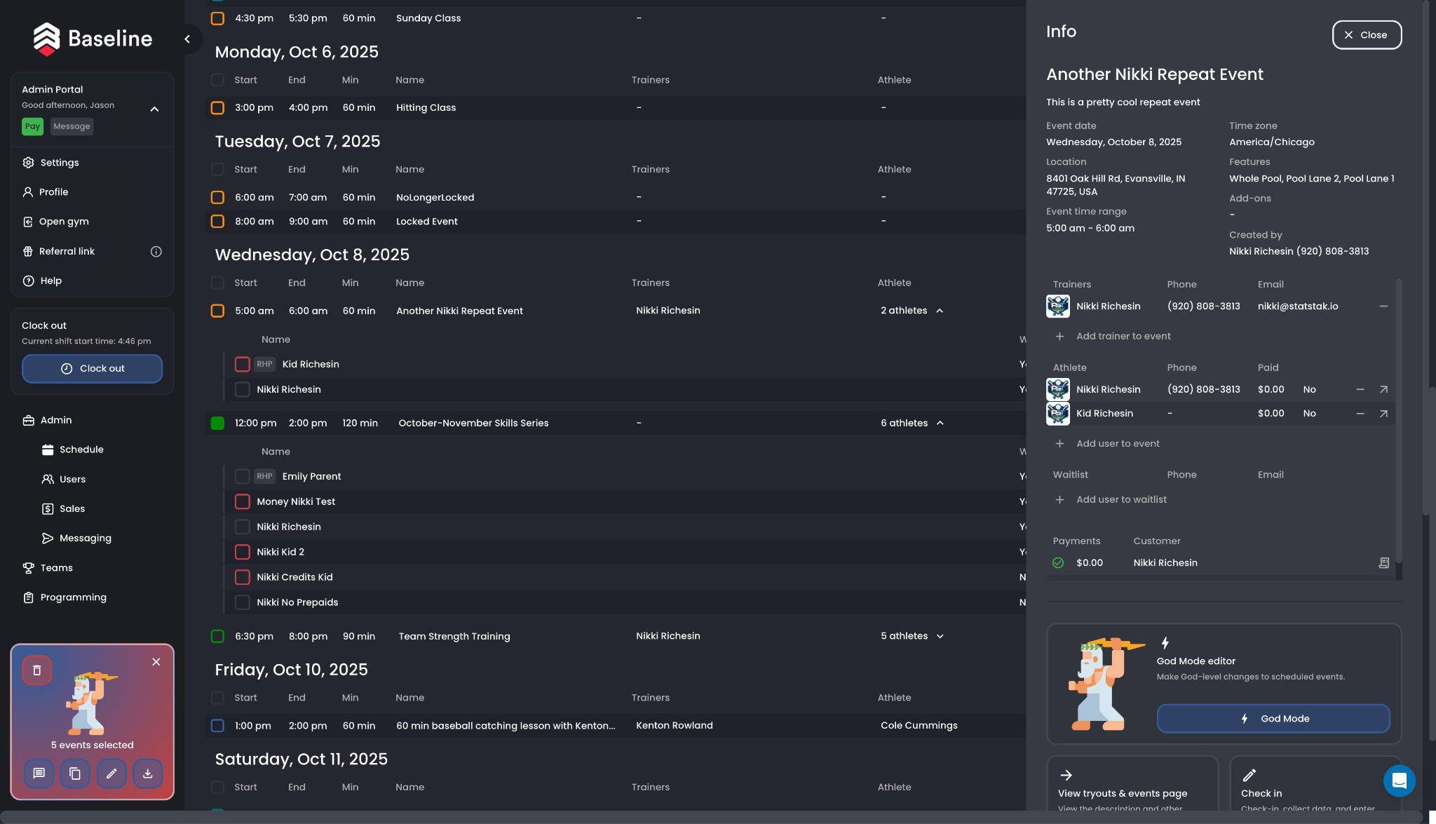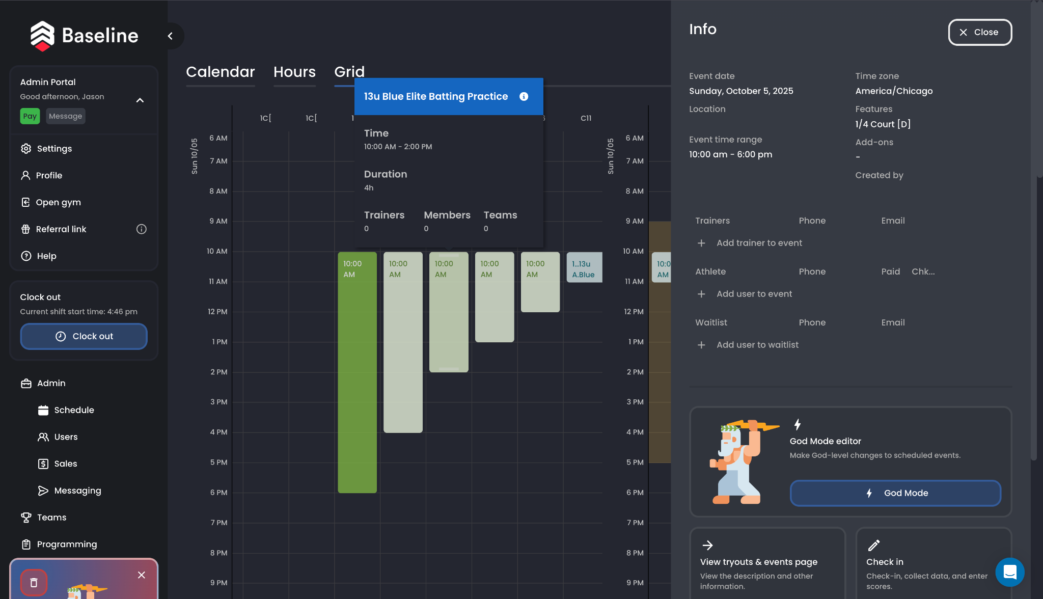 The grid displays your entire day across vertical columns, giving you more space to read cage names and event details. Events now show consolidated information in a sidebar with quick shortcuts for moving users between events and waitlists, plus access to associated series details.