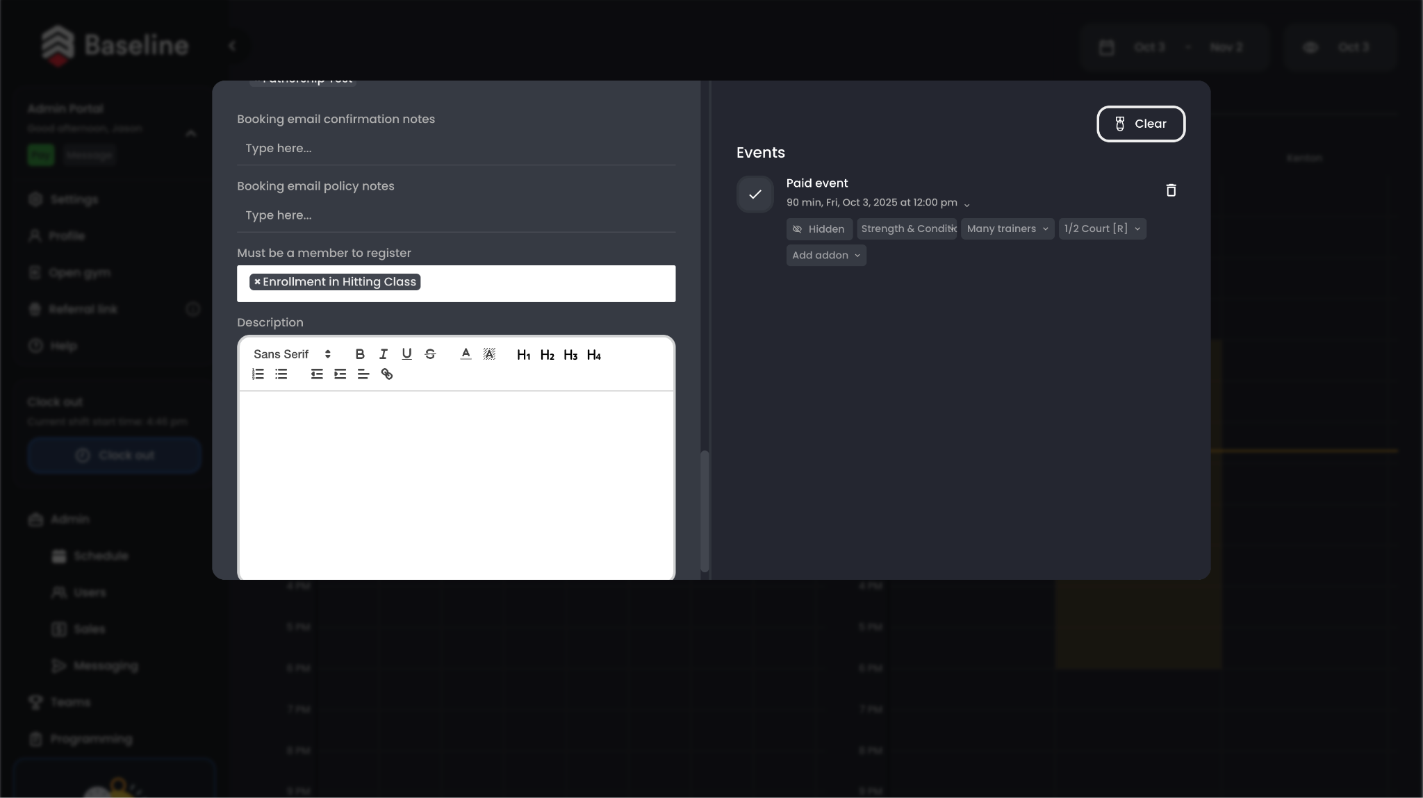 The new facility calendar lets you create events by clicking and dragging directly on the grid. You can view trainer availability alongside facility features, making it easier to spot scheduling conflicts before they happen.