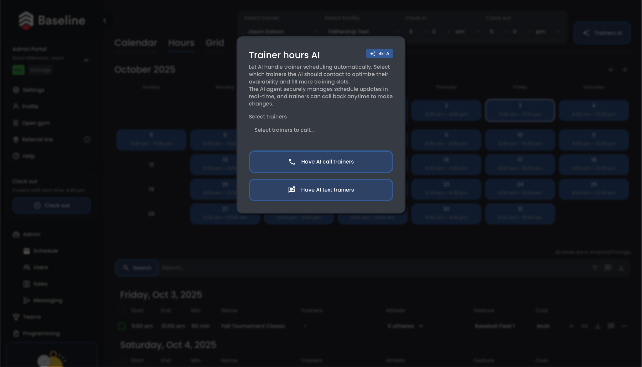 We have a new beta feature in need of testing. Meet Jarvis, our new AI scheduling agent. With Jarvis, trainers can verbally add availability for specific dates and times over the phone. The AI confirms each time block before committing it to your scheduling system. For example, a trainer can say they're available "Saturday October 4th from noon to 4pm and Monday October 6th from 5 to 8pm," and the system will repeat back the schedule for verification before saving.